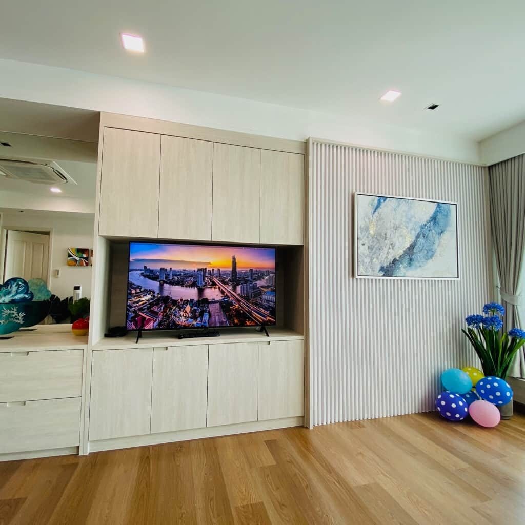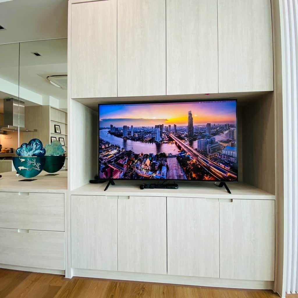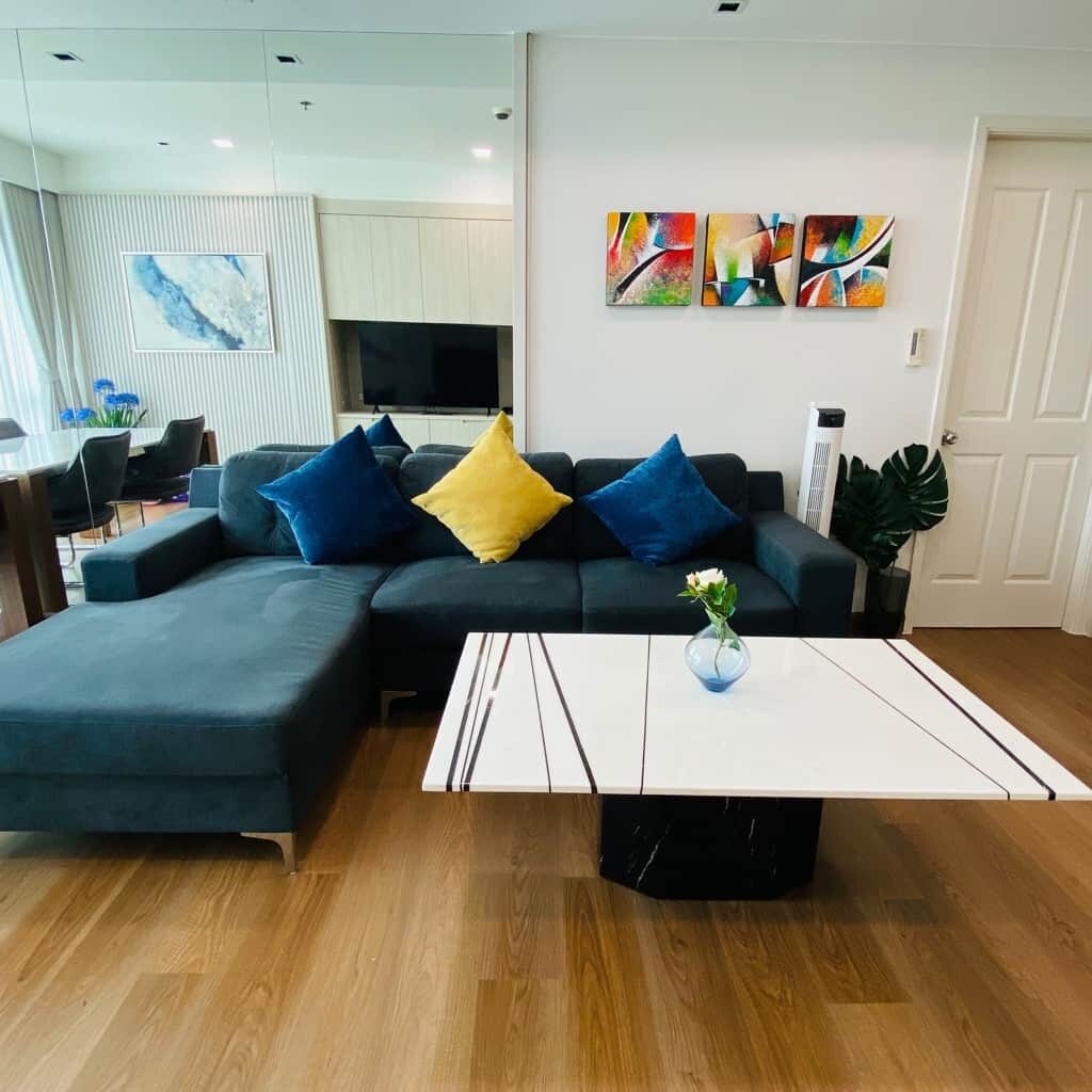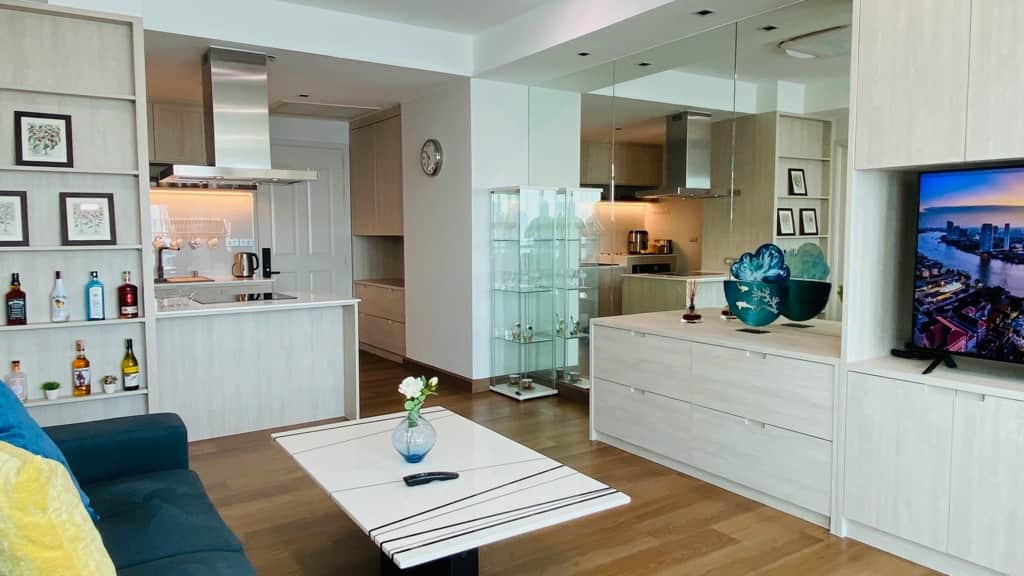 There is a large sofa facing the 55 inch LG Smart TV with a marble coffee table and rug. A number of storage options to ensure a clutter free living experience. All furniture is high quality and the whole apartment was redecorated in late 2019. There are a large number of power outlets and zoned LED ceiling lighting. The lounge / dining area has stunning views over the river.