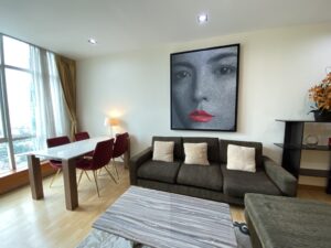 The lounge area There is a large sofa facing the TV with a marble coffee table and rug. A number of storage options to ensure a clutter free living experience. All furniture is high quality and the whole apartment was redecorated in late 2019. There are a large number of power outlets and zoned LED ceiling lighting. The lounge / dining area has stunning views over the river.